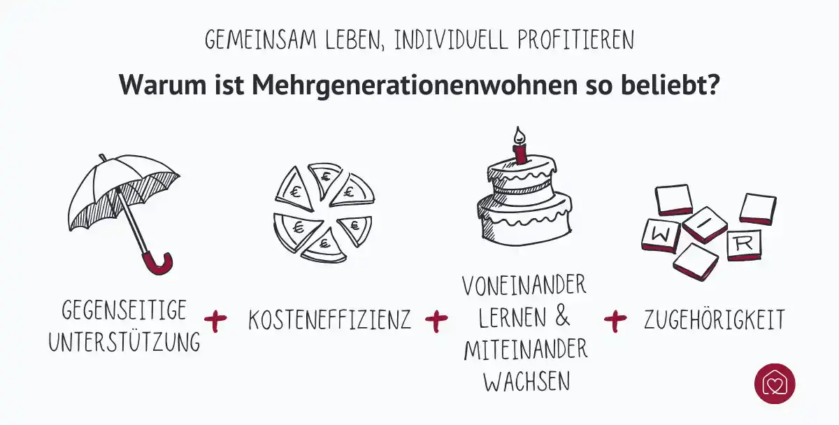 Verschiedene Personen unterschiedlichen Alters und Lebensphasen – verwandt oder nicht – nutzen die Vorteile des Zusammenlebens. Und davon gibt es so einige. Von alltäglicher Unterstützung und familiärer Gesellschaft bis hin zu praktischen Aspekten wie der langfristigen Kostenersparnis.